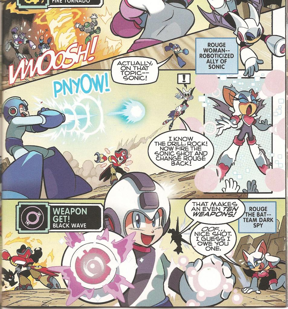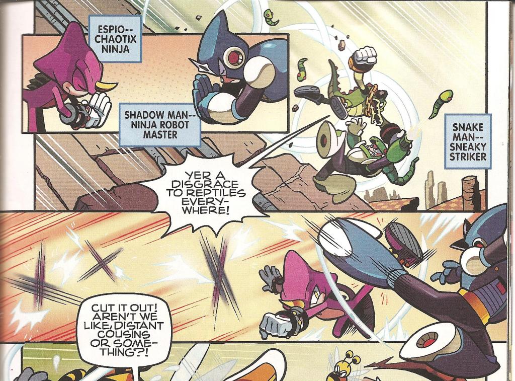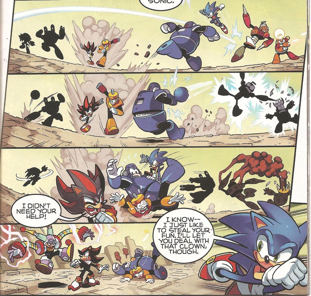 Suffice it to say, everybody gets a moment to shine in the punching fest, and there’s more to squee about than I have scans to provide; I like to keep those to an insightful minimum, after all. But here are some of the highlights NOT in my images. Napalm Man and Omega (no, the Sonic Omega…) having at it with all barrels firing, Blaze going nova and annihilating every fire based Robot Master in a single glorious explosion, Sonic getting into a road race with Charge Man, Quick Man, Nitro Man, and Quick Man, making the latter trip and go into a tumble while shouting “I hate that hedgehog!” like Robotnik did in the SatAM cartoon, while Flash Man goes into another midlife crisis while fighting Silver. Everyone, say it with me: “So… much… hair!“