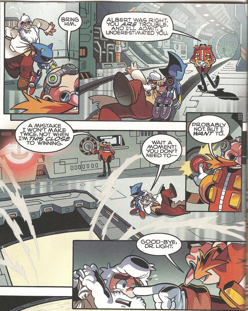 We return to Dr. Light in his cell, cobbling together a makeshift radio out of the busted down Metool and Motobug so he can try and reach anybody on Team Hero who might be tuning into the frequency. Well, someone is listening: Robotnik.