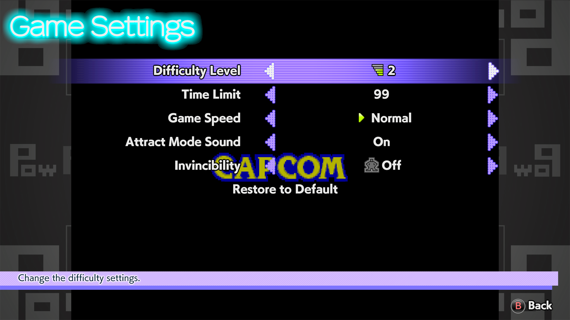 Neither game takes very long to complete, especially with the unlimited credits afforded you by the Capcom Arcade 2nd Stadium emulation, but there’s quite a bit of replay value in all the difference combinations of player characters, courses, and endings (with Power Fighters even offering special multiplayer endings as well). On top of that, there are other options you can choose ranging from speed to difficulty level, and even rewinding. Or heck, if the actual gameplay isn’t of any interest to you and you just want to play around to see the different characters, stages, music, and endings, there’s free downloadable content that allows you to turn on invincibility in the entire games catalogue.