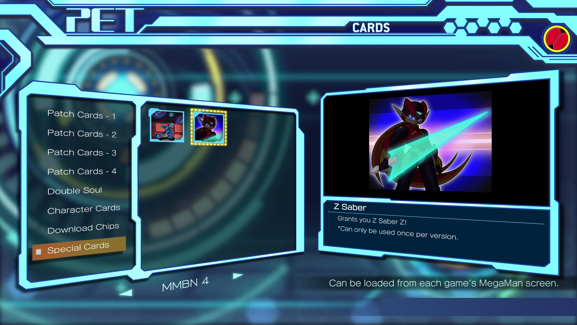 Elsewhere in the Gallery are more gameplay-relevant features. The first is Trophies, which are the in-game achievement system, and the other is Download Chips and, in Volume 2, Patch Cards. Download Chips show the different Battle Chips that were available through special events held in Japan, which you can download to your file once per playthrough, while Patch Cards are cards that get assigned to specific “addresses” and allow you to alter various gameplay elements. These include adding to MegaMan’s HP total, changing what the result of a charge shot will be, or activating Double Souls early and making them your default form. These can be activated from the “MegaMan” menu within each title, but in the Gallery, you can click on each to view some beautiful high-resolution versions of each chip or card’s art.