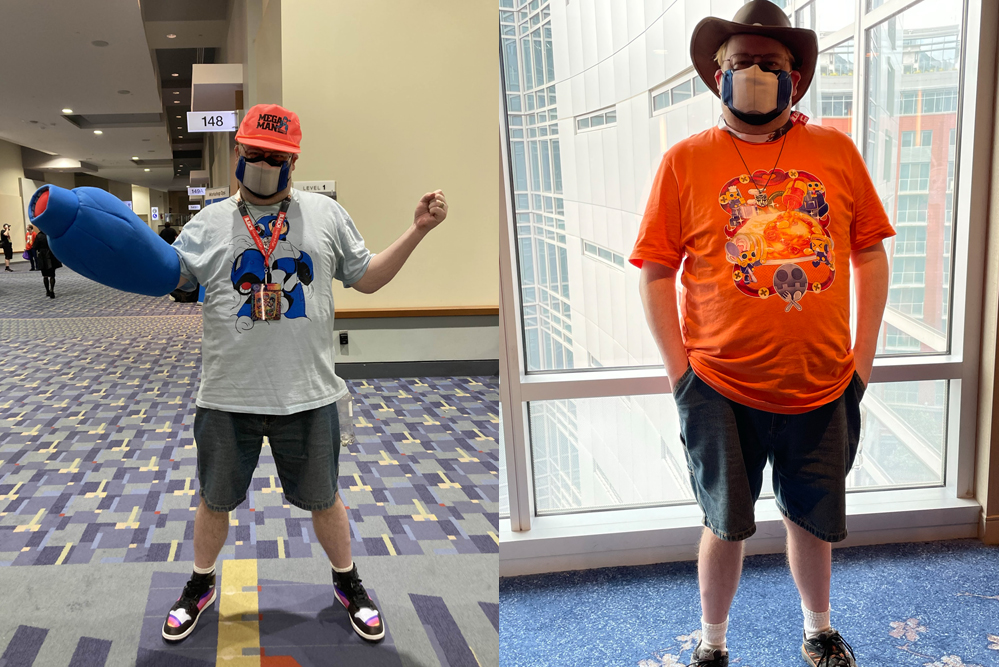 After our suitcase arrived (I had my stuff in my carry-on, but I held off in solidarity with my wife), I wore my own sort of attempt/take on the concept, which you can see above at left. And by “attempt/take on the concept,” I mean I probably overdid it and made it way too obvious, what with my MegaMix Mega Man shirt, plush Mega Buster, and vintage Mega Man hat from the Consumer Electronics Show. Which was on purpose, but I don’t know if it vibed well.