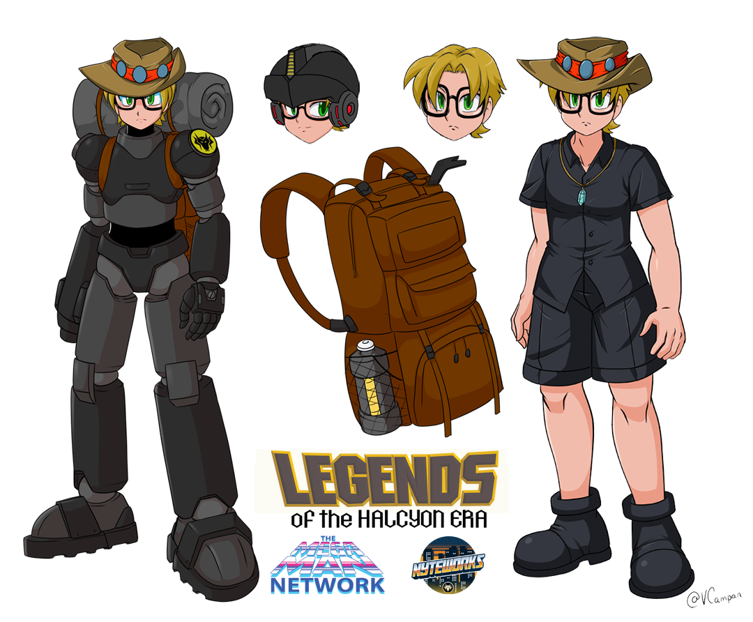 Weapons/Attacks: His right arm is equipped with a unique Buster of his own design, dubbed the “Nyte-Buster.” It is unique in that it has three modes: standard Buster, saber-arm (“Nyte-Saber”), and shield-arm (“Nyte-Shield”). The power of the blade and shield are only equal to that of the Buster at the time, though these can be upgraded with new Buster parts. He also keeps a backpack full of equipment and weapons kits that can be assembled on-site, including a Powered Buster and Splash Mines. His favorite kit is one of his own design for an energy-based Gatling Buster, which he usually equips before heading into a ruin.